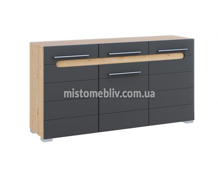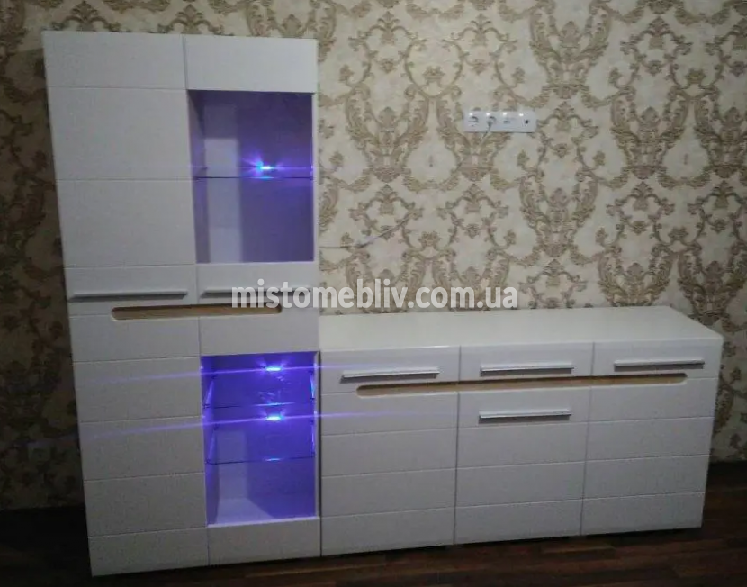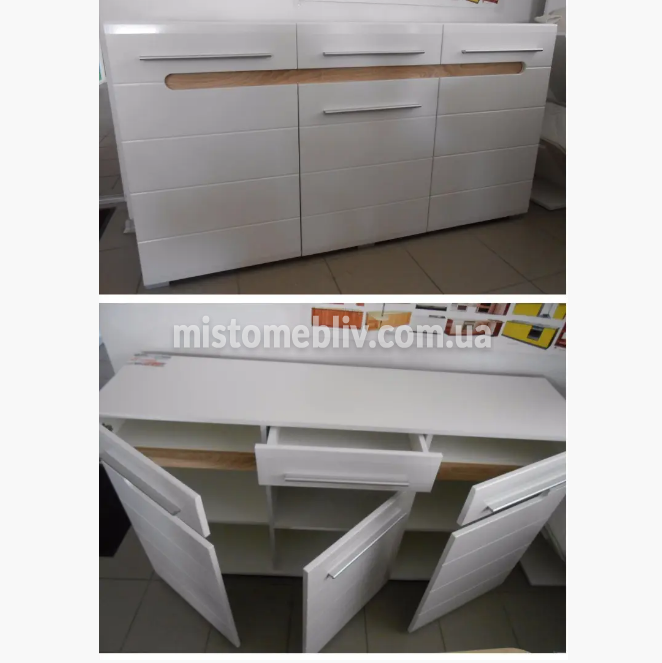 У комплект входять чотири висувні ящики з довими ергономічними ручками. Корпус комода виготовлений із високоякісного меблевого ДСП. Матеріал для фасаду використовують МДФ. Для корпусу та фасаду використовують поєднання кольорів: білий/білий+вставка дуб сонома, дуб артизан/графіт. Фасад комода білий має гладку глянцову поверхню. Місткі ніши дозволяють зберігати велику кількість потрібних речей. Механізм висування ящиків – телескопічні направляючі.