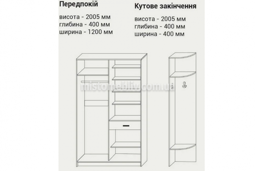 Корпус та фасади даного передпокою виготовлені із ДСП. Передпокій на розсувній системі. Конструкція передпокою не змінна!Кутове закінчення може бути ліве чи праве (універсальне).