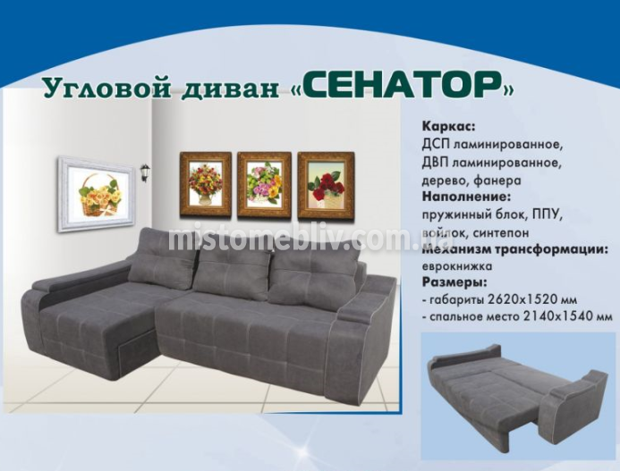 Кутова софа Сенатор складається з дерева, ламінованого ДCП, ламінованого ДВП та фанери. Пружинний блок покритий повстю, далі поролон, синтепон і меблева тканина. Кутова софа Сенатор розкладається єврокнижкою - це дуже надійний механізм і прослужить Вам довго і при щоденному використанні. Розкласти його зможуть навіть менші члени Вашої сім'ї. Кутова софа Сенатор має досить цікавий дизайн. Під спину передбачені 3 подушки, регулювати положення яких може кожен, щоб розташуватися зручніше. Також кутова софа Сенатор має велику нішу для постільної білизни під висувним сидінням та ніши в боковинах. Купити кутова софа Сенатор фабрики М'яка Лінія Ви можете в інтернет-магазині «MISTO MEBLIV», оформивши замовлення на нашому сайті або зателефонувавши на номер, вказаний в контактах нашої компанії. Також Ви можете скористатися нашою доставкою і послугами нашого професійного збирача.